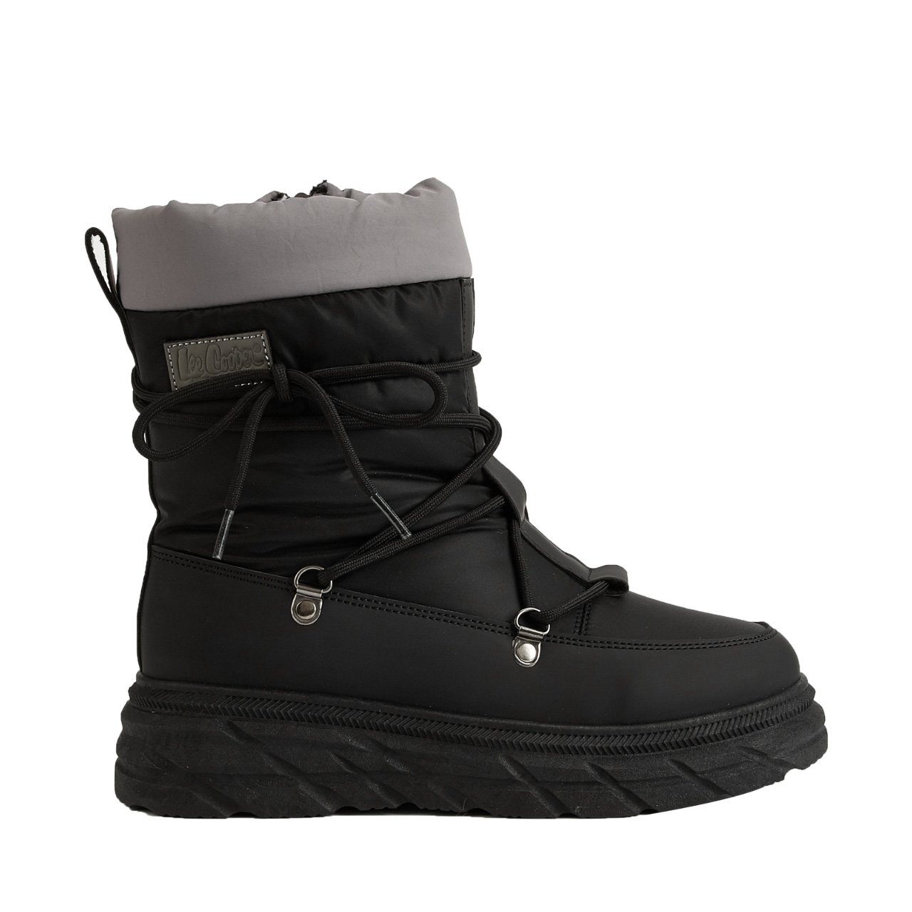 Buty damskie Lee Cooper sprawdzą się w okresie zimowym. Cholewka wykonana z materiału tekstylnego o hydrofobowych właściwościach zapewni ochronę przed wilgocią. Syntetyczne wzmocnienia. Zamek w bocznej, wewnętrznej części. Uchwyt zlokalizowany z tyłu. Specjalny system sznurowania. Wnętrze pokryto miękkim futerkiem. Gumowa podeszwa zewnętrzna z przyczepnym bieżnikiem.