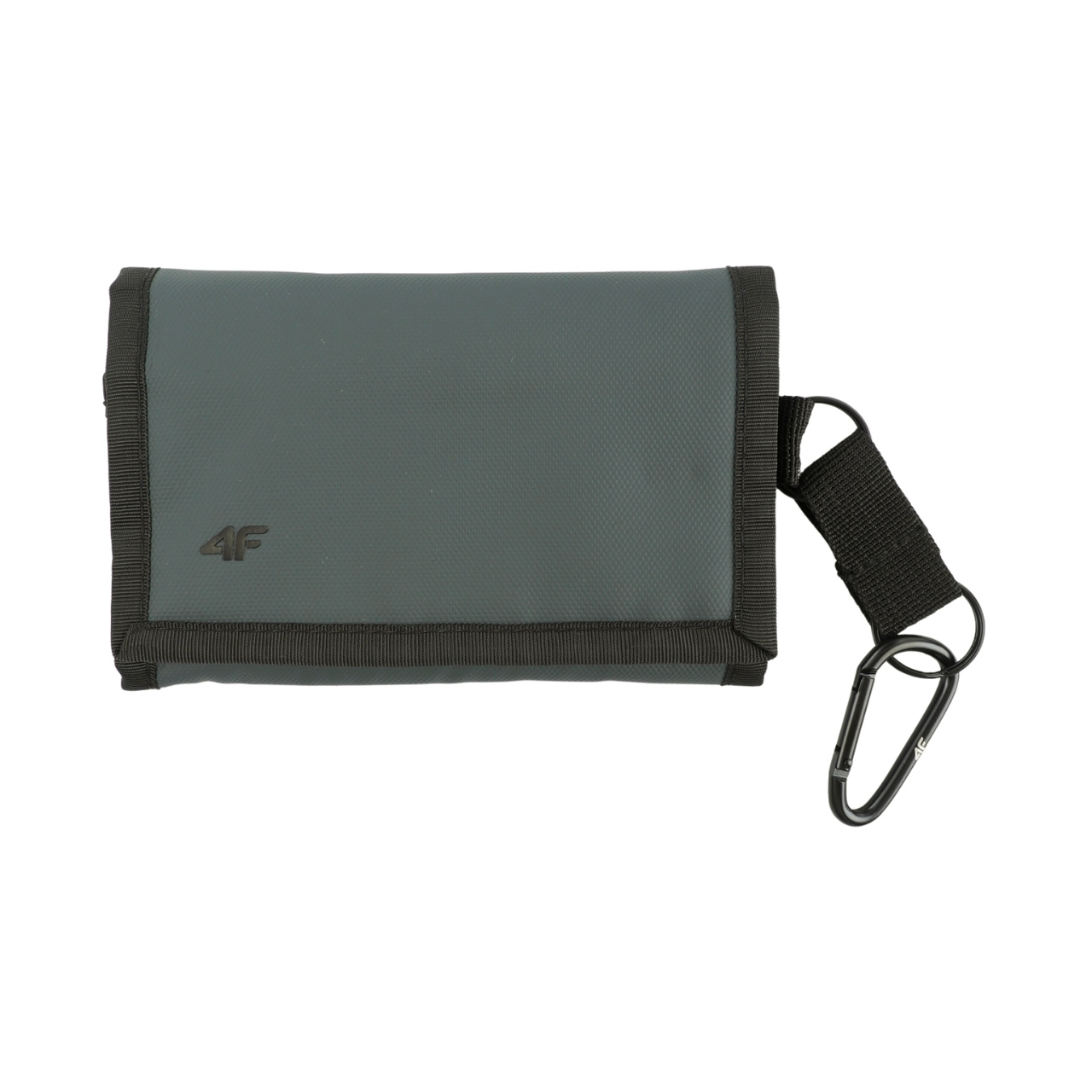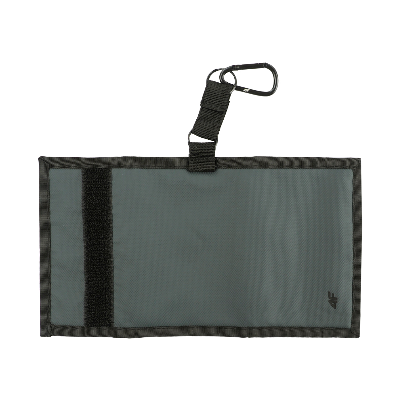 Uniwersalny portfel 4F w kolorze antracytowym. Zapinany na rzep. W środku kieszeń na banknoty i kieszeń na monety zapinane na suwak. Przegródki na karty. Karabińczyk, który umożliwia przypięcie portfela np. do spodni. Powierzchnia zewnętrzna pokryta hydrofobowa powłoka, która chroni przed wilgocią.