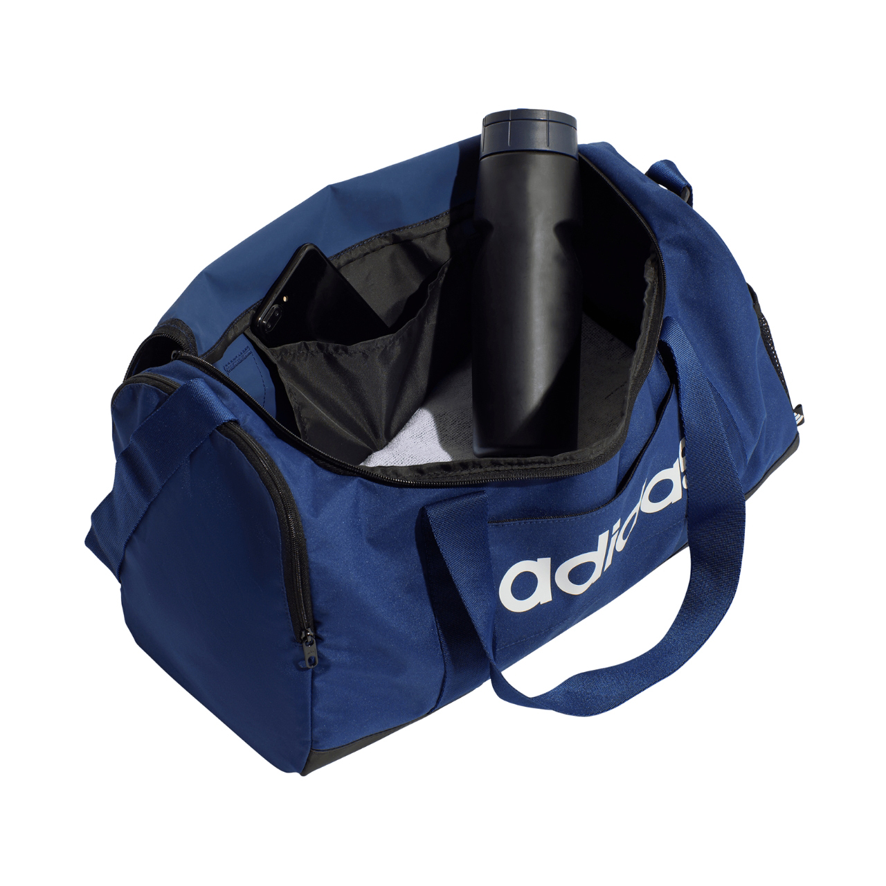 Mała torba adidas na regulowanym pasku. Torba sportowa typu duffel. Kompaktowe rozmiary i przemyślana konstrukcja. Komora główna zapinana na suwak. Oddzielna przegroda na buty. Dodatkowe kieszenie na suwak zewnętrzne i wewnętrzne. Regulowany pasek z przesuwaną podkładką i uchwyty. Duże, kontrastowe logo adidas na froncie.