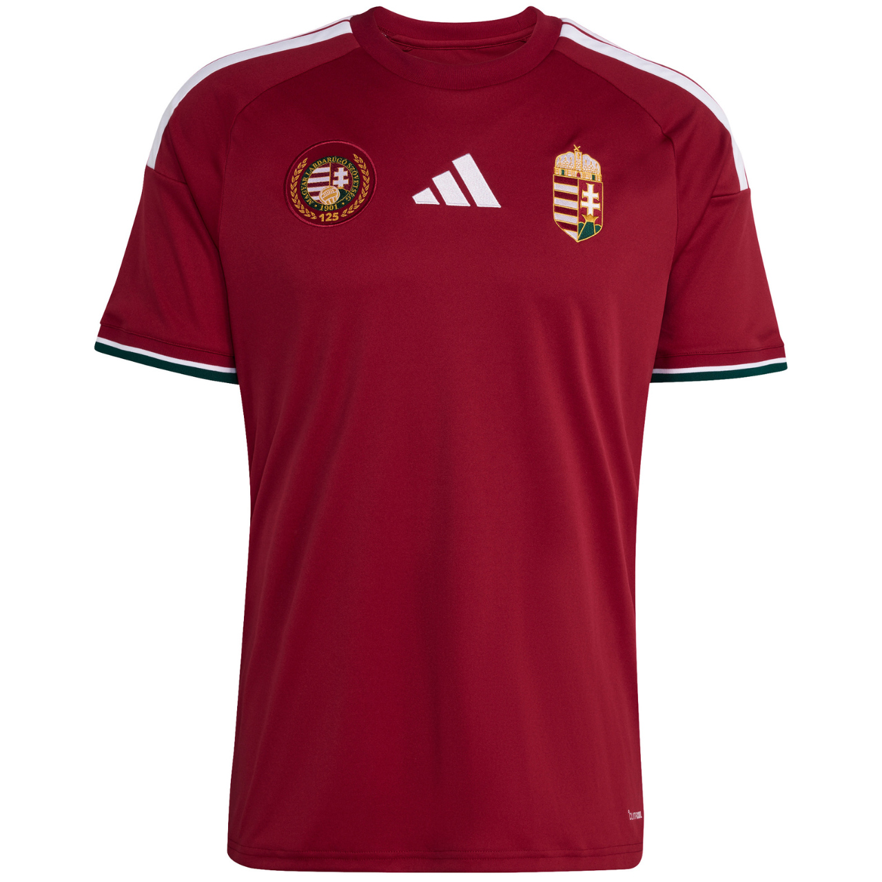 Męska koszulka podstawowa adidas została stworzona z okazji 125. rocznicy federacji Węgier. Krótkie rękawy. Technologia Climacool zapewnia optymalną wentylację, odprowadzanie potu i suchość nawet podczas intensywnych treningów. Dopasowany krój. Prążkowany dekolt. Subtelne logo adidas, charakterystyczne trzy paski i godło reprezentacji.