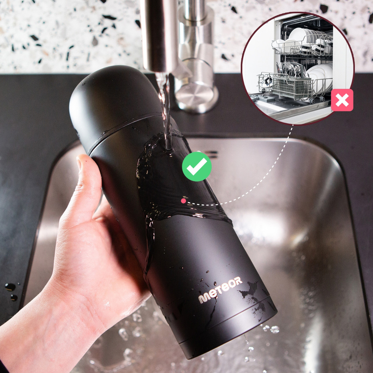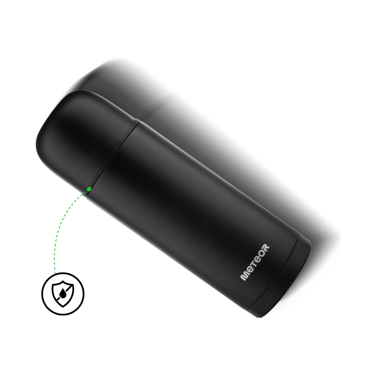 Termos Meteor sprawdzi się podczas codziennego użytkowania. Kompaktowa i lekka konstrukcja z szerokim otworem usprawni napełnianie i czyszczenie termosu. Pokrywka może jednocześnie służąc jako kubek do picia z wkładką izolacyjną. Pod spodem znajduje się drugi kubeczek, umożliwiający podzielenie się napojem z innymi. Korek regulowany za pomocą przycisku ułatwia nalewanie jedną ręką, a także jest wyposażony w uszczelkę zabezpieczającą przed przeciekaniem i utratą ciepła. Technologia próżniowa gwarantuje maksymalne utrzymanie temperatury przez 24 godziny, zarówno dla zimnego, jak i ciepłego płynu. Podwójne ścianki posiadają między sobą próżnię, która izoluje temperaturę wewnątrz od temperatury otoczenia. Wykonanie z wysokogatunkowej stali nierdzewnej 18/8 oferuje właściwości, które chronią gorące napoje przed wychłodzeniem i zimne przed nagrzaniem z zewnątrz. Dodatkowo, stal nierdzewna jest bezpieczna w kontakcie z żywnością i nie pochłania smaków ani zapachów. Obudowa pomalowana metodą proszkową zwiększa odporność na drobne rysy. Nie zawiera substancji szkodliwych. Wykonanie z materiałów pozbawionych związków BPA. Termos można rozłożyć na części.